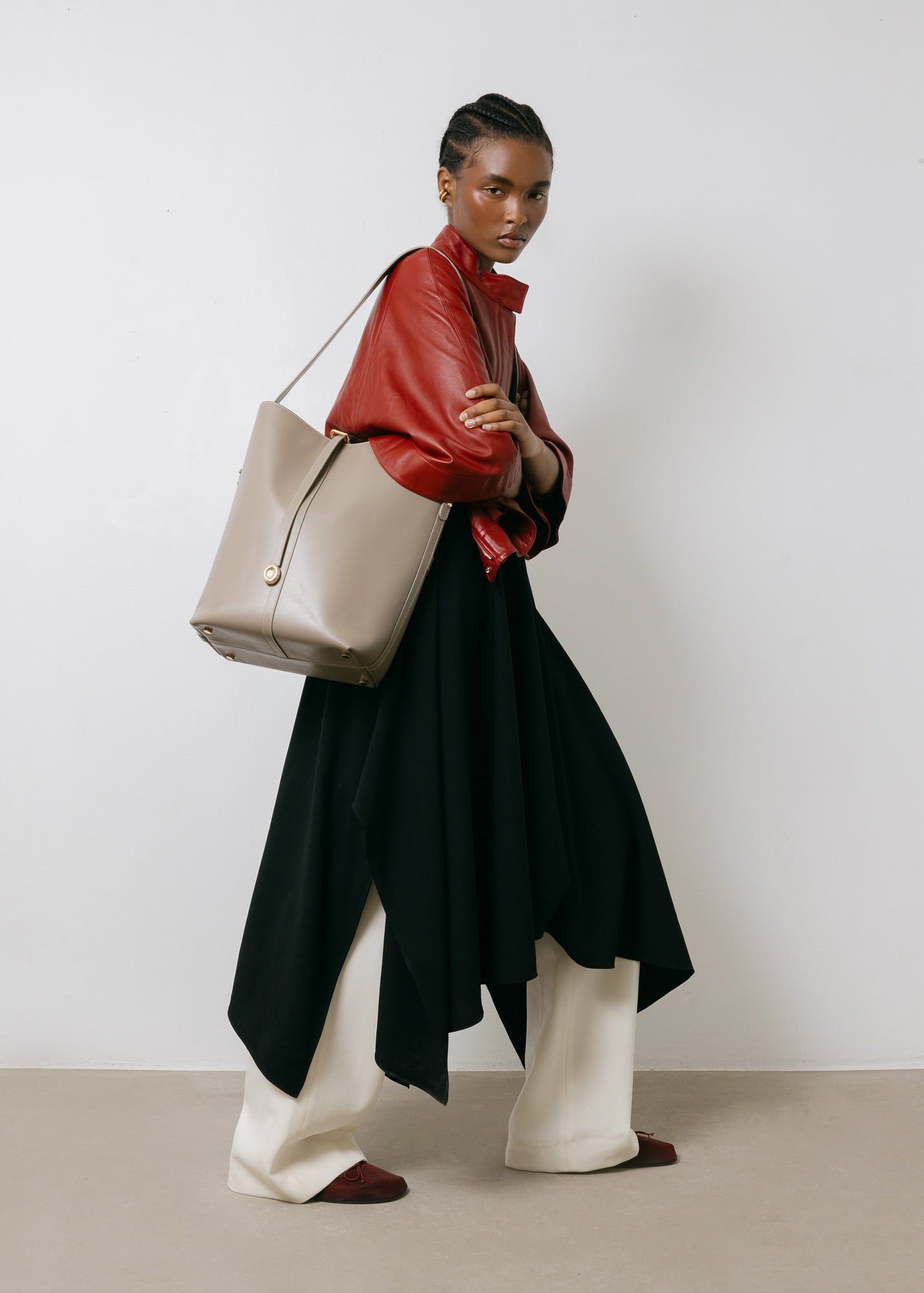 The Bucket Bag is a soft work bag with a structured bottom to be able to hold heavy items without compromising on quality. It sits elegantly on your shoulder and can be adjusted into a cross body bag. It's lightweight and comfortable to wear due to the wide shoulder strap.