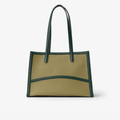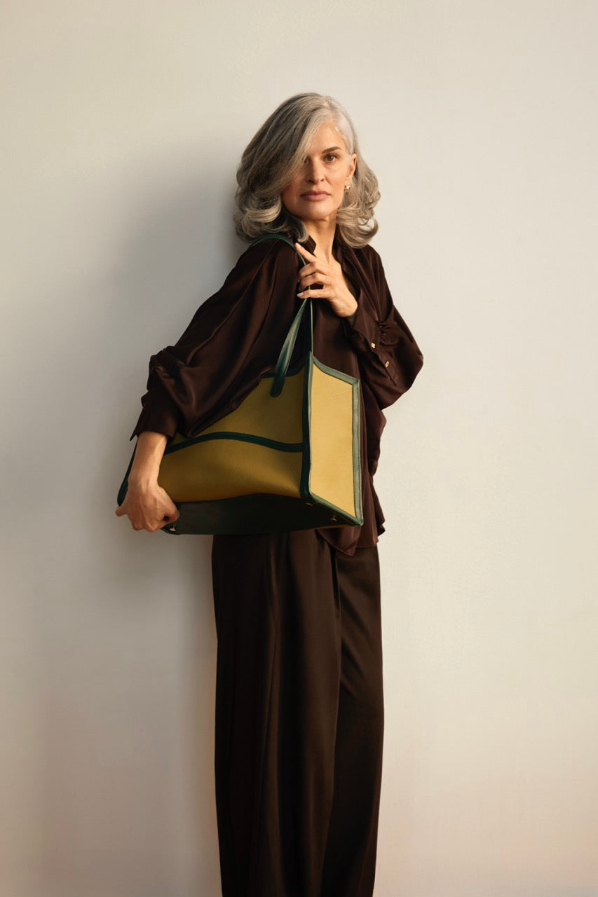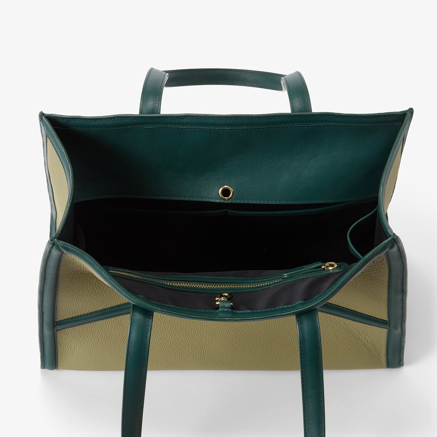 The Capacious Tote (Mocha/Gold) packed with daily essentials like books, a wallet, a lunchbox, and shoes, demonstrating its generous storage capacity.