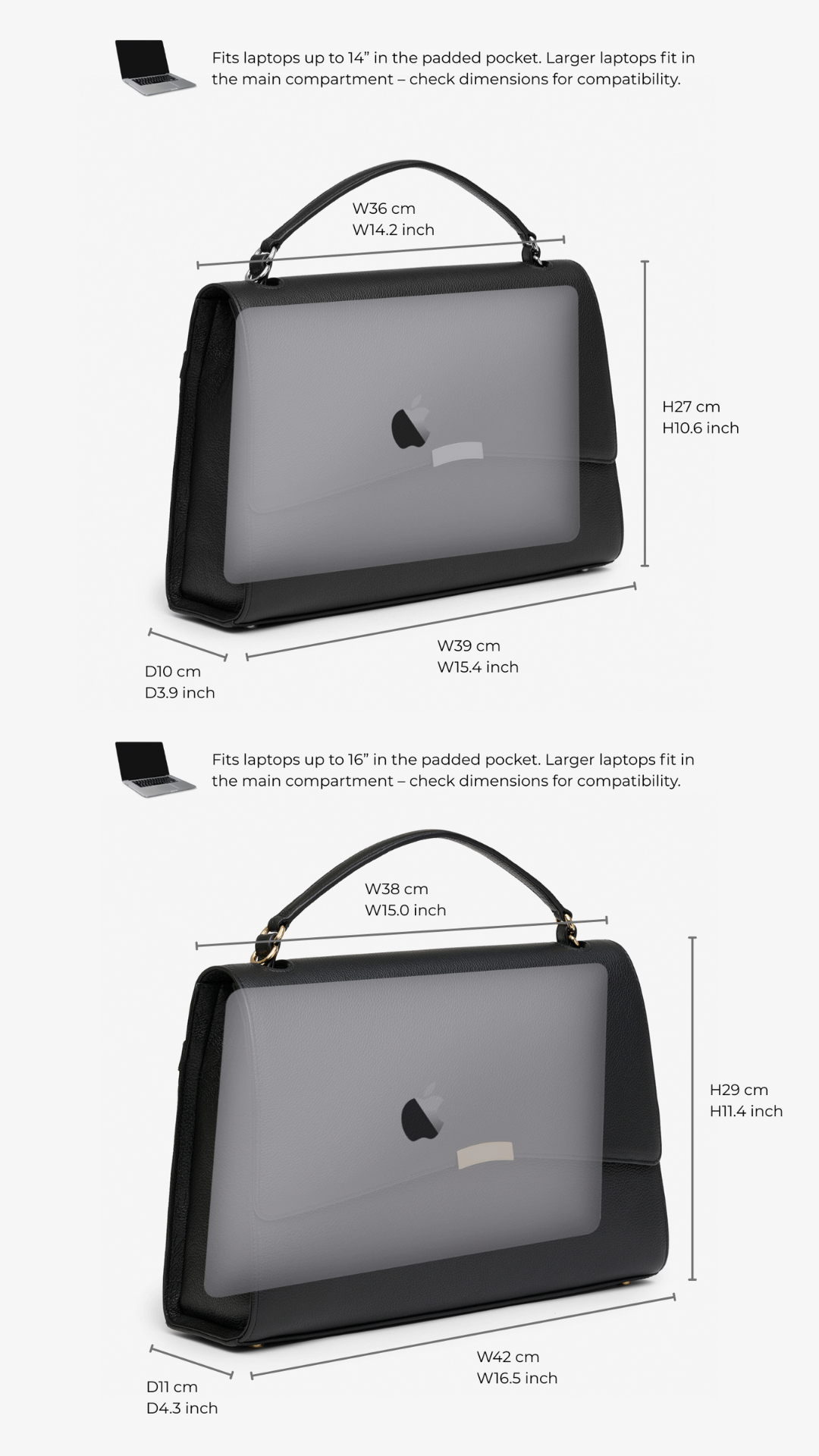 Signature Briefcase in black/gold showcasing its open layout – ready to carry everything from laptop to personal accessories.